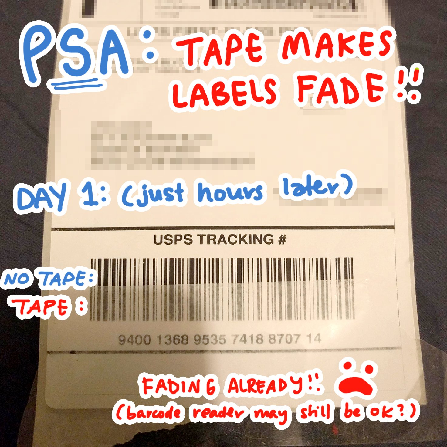 Fading Shipping Labels? - Welcome to the Etsy Community I use Duck EZ start packing tape and tape over my labels. I noticed recently that the type on my labels has begun to fade after the tape is applied. I'm not certain if it is the tape I use, or summer heat and humidity. It is a little more concerning now that USPS packages are sitting longer and it is taking longer for packages to be delivered.